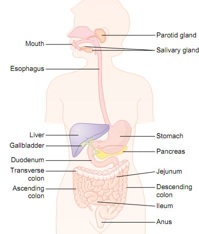 The Gastrointestinal system consists a group of organs designed to take in foods, initially process foods, digest the foods, and eliminate unused of materials of food items. It is a hollow tubular system from one end of the body to the other end. The major organs of the gastrointestinal tract include; the mouth or oral complex, pharynx, esophagus, stomach, small intestine and associated glands, large intestines, rectum and anal canal and anus. In addition, the liver, gall bladder and pancreas are considered as accessory organ of digestion, which are necessary for the digestive process but are not a direct part of the digestive tract. They release substances into the digestive tract through ducts.