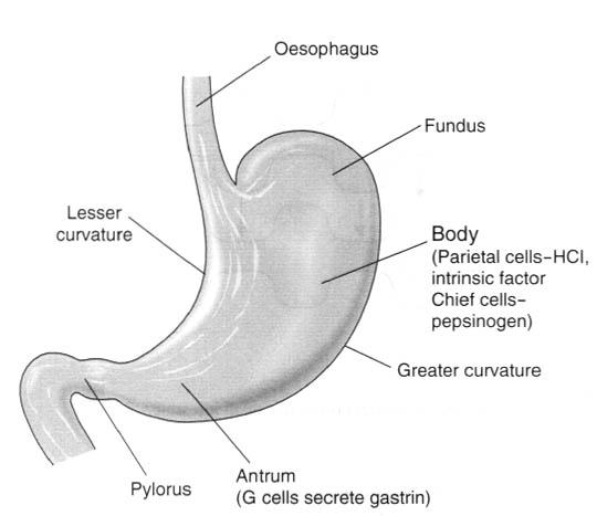 The stomach is J-shaped relatively vertical in tall people, and more horizontal in short people